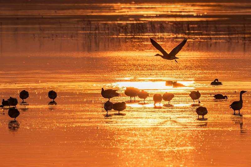 △夕阳下,河北张家口察北一湖泊宛如童话世界,小天鹅、大雁、翘鼻麻鸭等各种秋季迁徙的水鸟在水中嬉戏,在空中自由飞翔。