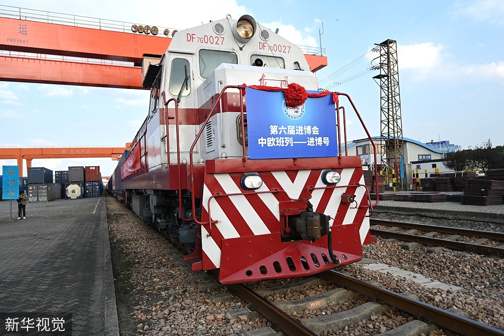 2023年10月11日,上海,装载有第六届进博会的展品,今年第一列“中欧班列-进博号”今天抵达上海闵行站。(新华视觉)