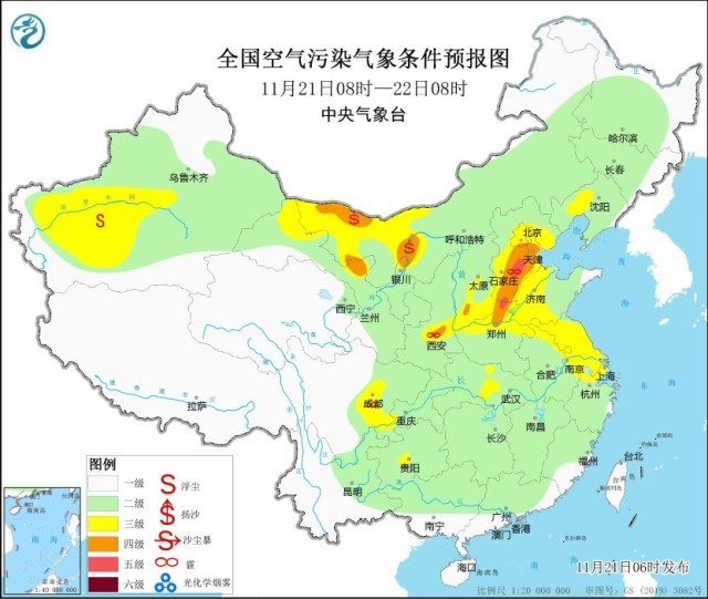 在寒潮到来前,今天白天,华北中南部、黄淮、陕西关中等地大气扩散条件较差,有轻至中度霾,局地有重度霾,21日早晨至上午,河北南部、山东南部、江苏大部等地的部分地区有大雾天气。22日白天起,受冷空气影响,上述地区的雾和霾将逐渐消散。