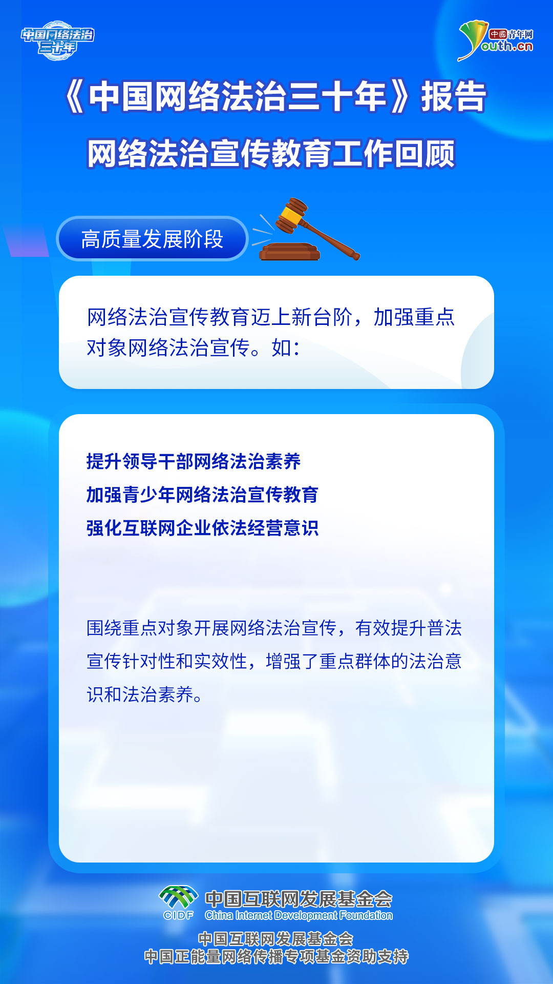网络法治宣传教育是推进网络空间法治化的长期基础性工作。中国全功能接入互联网30年来,网络法治宣传不断深化,网络法治理论研究和教育深入开展,尊法学法守法用法日益成为网络空间广泛共识和基本准则,社会主义法治精神在网络空间得到全面彰显。