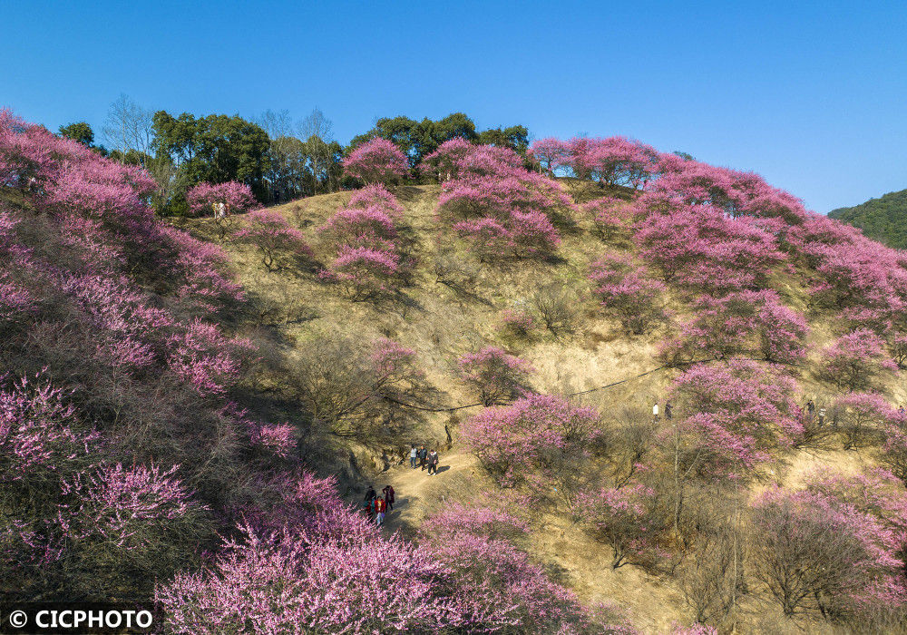 ↑2023年2月15日,在浙江省宁波市奉化区溪口镇新建村,游客在梅花林中赏花游玩。(无人机照片)CICPHOTO/胡学军 摄